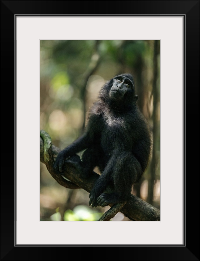 <p>Celebes crested macaque (Macaca Nigra) sitting on a tree limb in Tangkoko Batuangus nature reserve, Indonesia. Bitung Utara, Batuputih Atas, Kecamatan Ranowulu, Kota Bitung, Sulawesi Utara, Indonesia.</p>