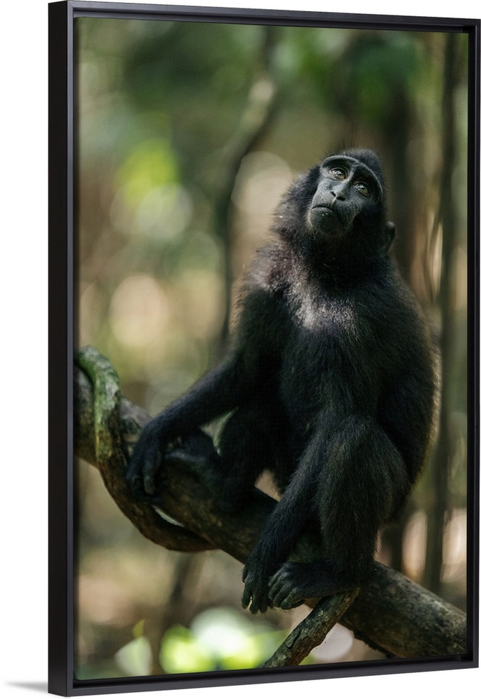 <p>Celebes crested macaque (Macaca Nigra) sitting on a tree limb in Tangkoko Batuangus nature reserve, Indonesia. Bitung Utara, Batuputih Atas, Kecamatan Ranowulu, Kota Bitung, Sulawesi Utara, Indonesia.</p>