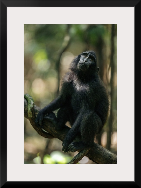 <p>Celebes crested macaque (Macaca Nigra) sitting on a tree limb in Tangkoko Batuangus nature reserve, Indonesia. Bitung Utara, Batuputih Atas, Kecamatan Ranowulu, Kota Bitung, Sulawesi Utara, Indonesia.</p>