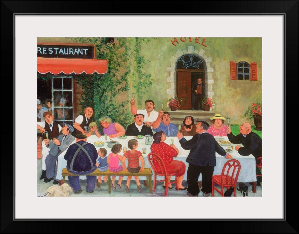 <p>Contemporary painting of people eating at a banquet outdoors in a French town.</p>