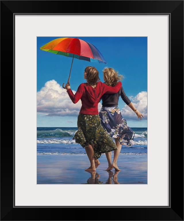 <p>A contemporary painting of two woman walking along the beach waves while holding an umbrella.</p>