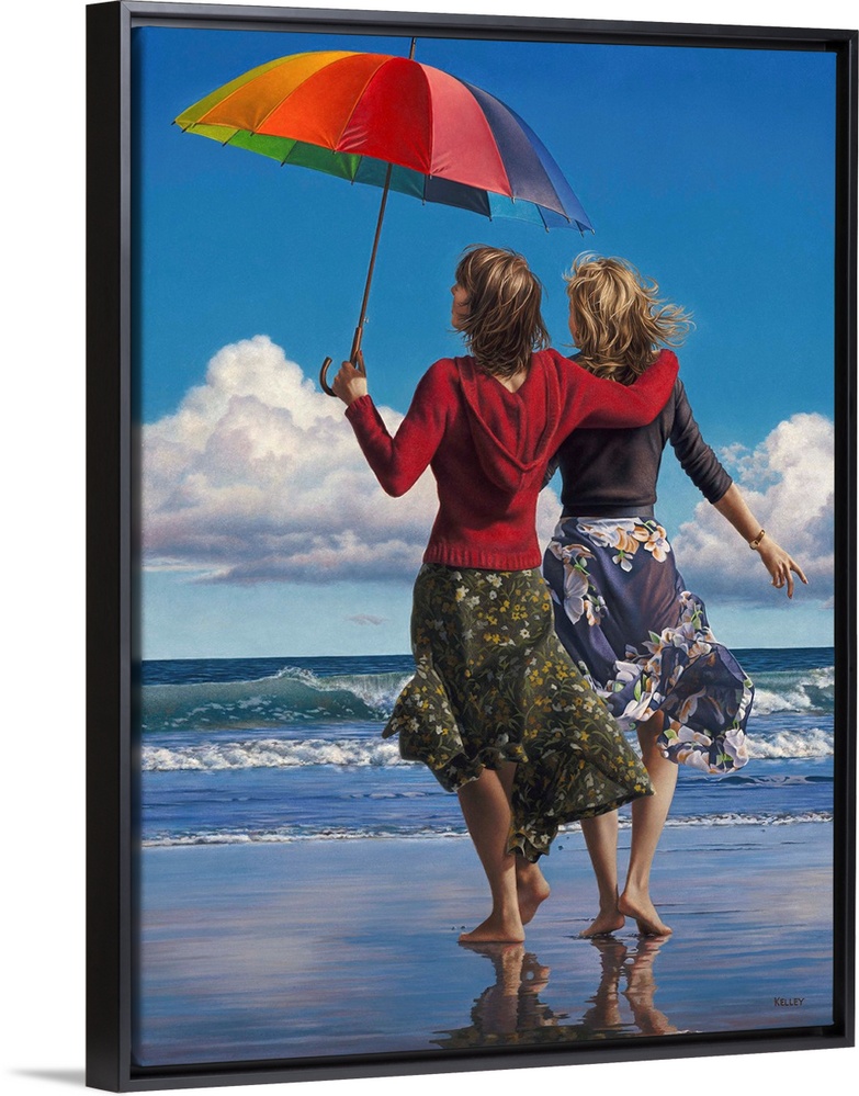 <p>A contemporary painting of two woman walking along the beach waves while holding an umbrella.</p>