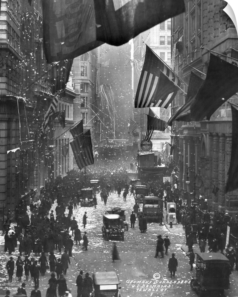 <p>Celebrations on Wall Street in New York City, following the Armistice with Germany after World War I. Photograph, 1918.</p>