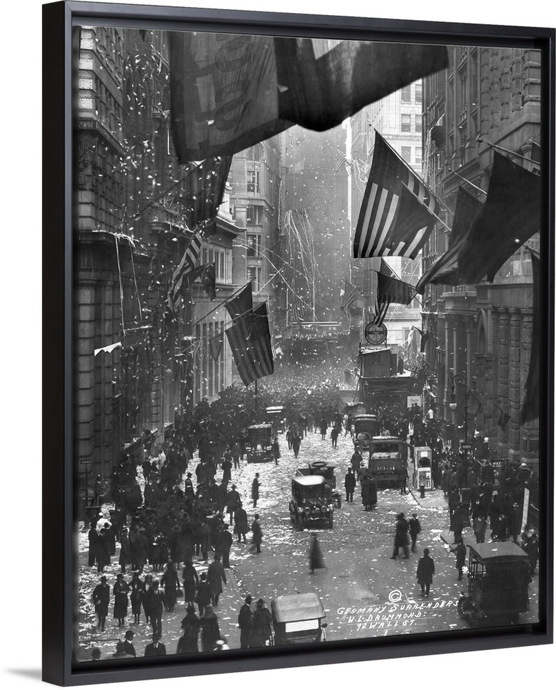 <p>Celebrations on Wall Street in New York City, following the Armistice with Germany after World War I. Photograph, 1918.</p>