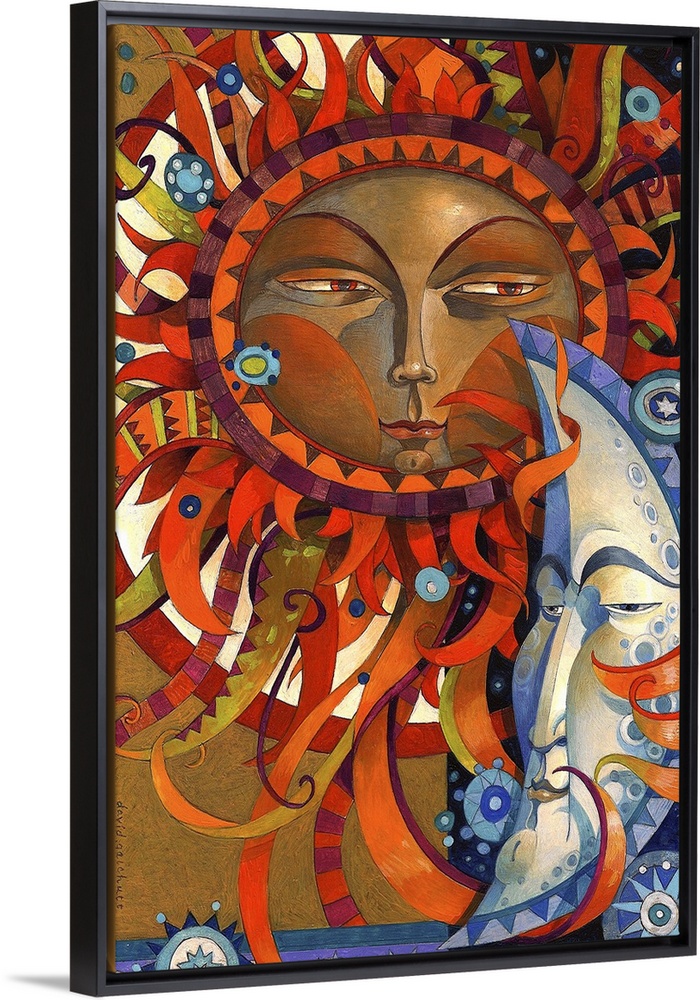<p>Contemporary artwork of a sun with a face and sun rays fanning out in all directions, next to a moon with a face on it.</p>