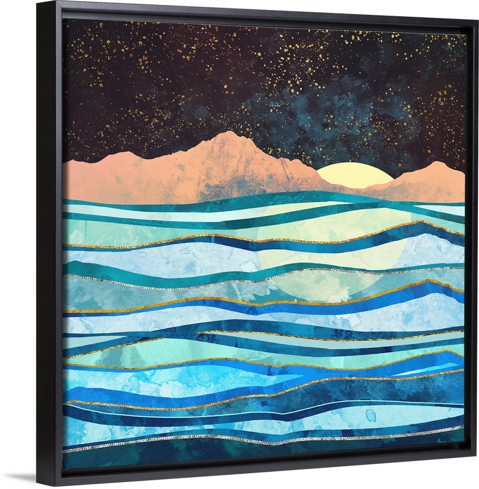 <p>Abstract depiction of a seascape with waves, mountains and stars.</p>