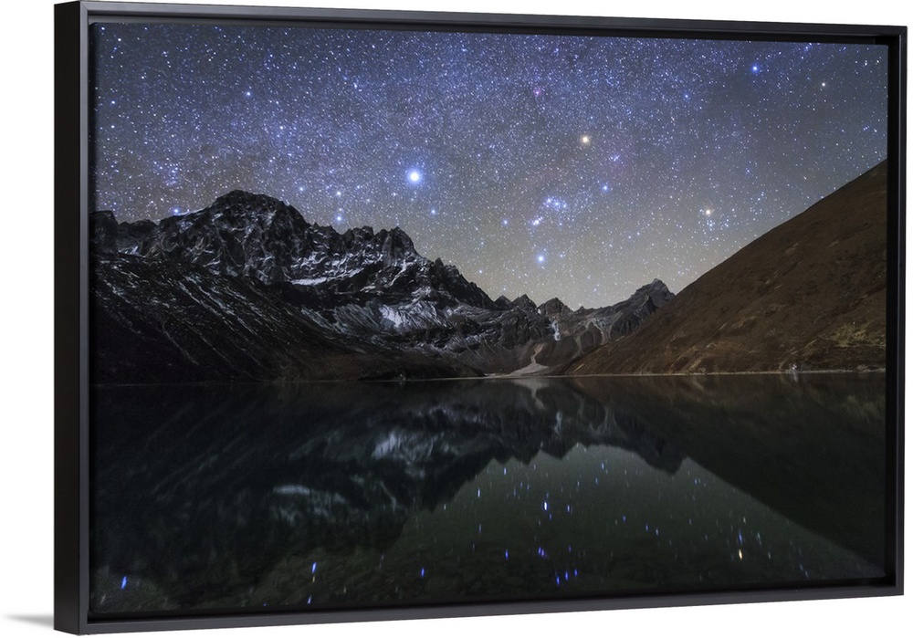 <p>The winter Milky Way with bright Sirius, Orion and Aldebaran shining above the moonlight mountainscape of Pharilapche at Sagarmatha National Park of Nepal. The stars and the snow peak were beautifully reflected in the Lake Dudh Pokhari.</p>