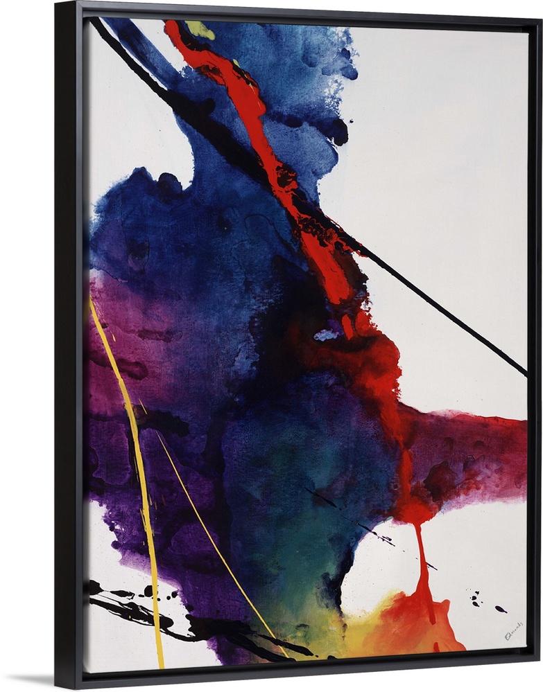<p>Contemporary watercolor painting of a multicolored mass with thin streaks of paint over a solid neutral background.</p>