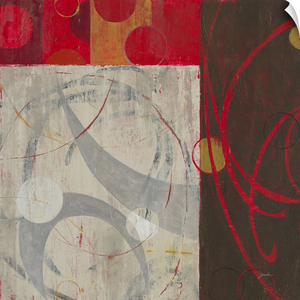 <p>A square abstract painting of curved lines and patterned shapes in bold primary colors.</p>