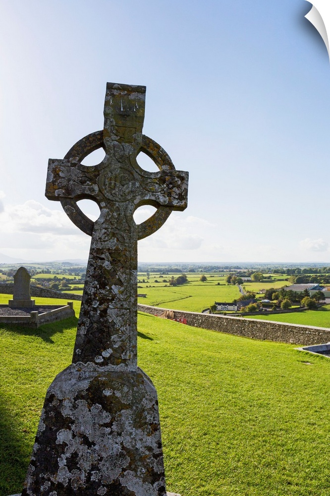 <p>Celtic cross on grassy hill with stone wall under blue sky, Cashel, County Tipperary, Ireland.</p>
