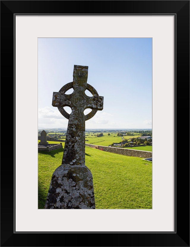 <p>Celtic cross on grassy hill with stone wall under blue sky, Cashel, County Tipperary, Ireland.</p>
