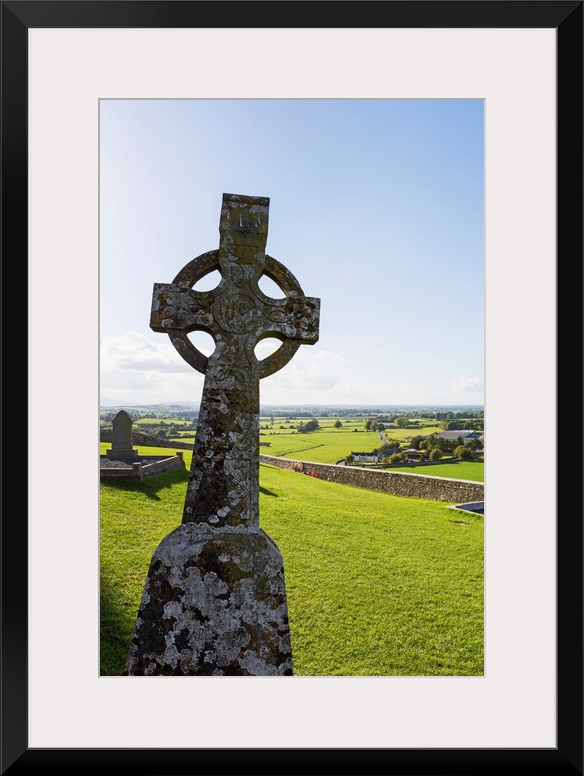 <p>Celtic cross on grassy hill with stone wall under blue sky, Cashel, County Tipperary, Ireland.</p>