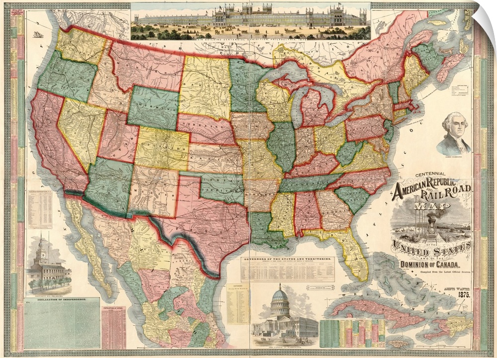 <p>Watson's railroad map of the United States detailing names of all the towns with railroad stops. Includes numerous charts containing statistical data and the text of the Declaration of Independence.</p>