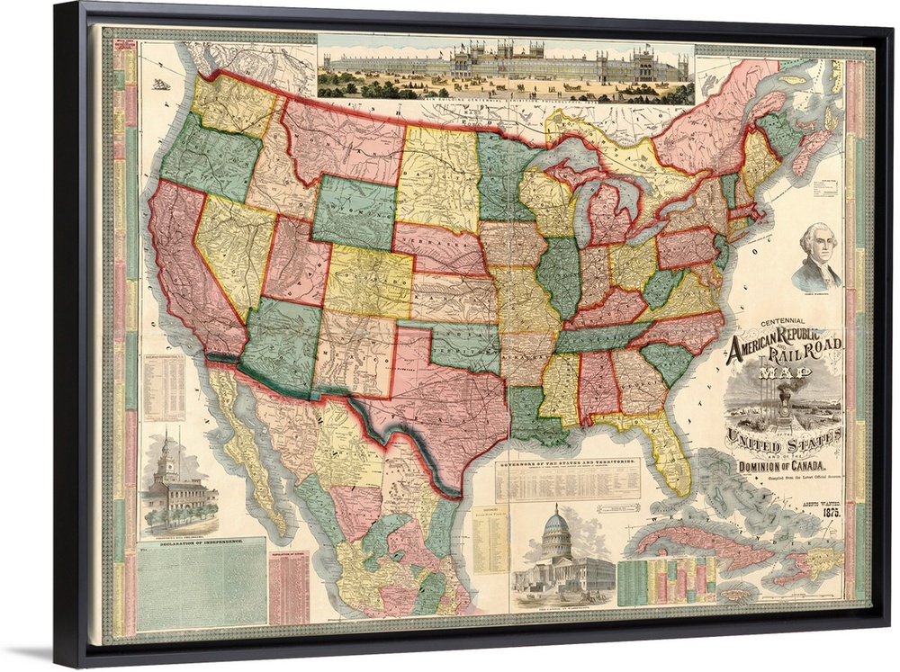 <p>Watson's railroad map of the United States detailing names of all the towns with railroad stops. Includes numerous charts containing statistical data and the text of the Declaration of Independence.</p>