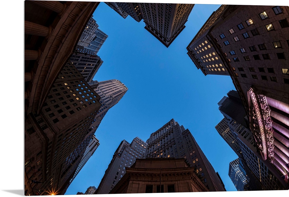 <p>Center of Wall Street at twilight. New York City, New York, United States of America.</p>