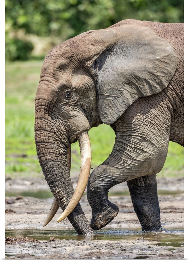<p>Central African Republic, Dzanga-Ndoki, Dzanga-Bai. A fine bull Forest elephant sucking up minerals at Dzanga-Bai.</p>