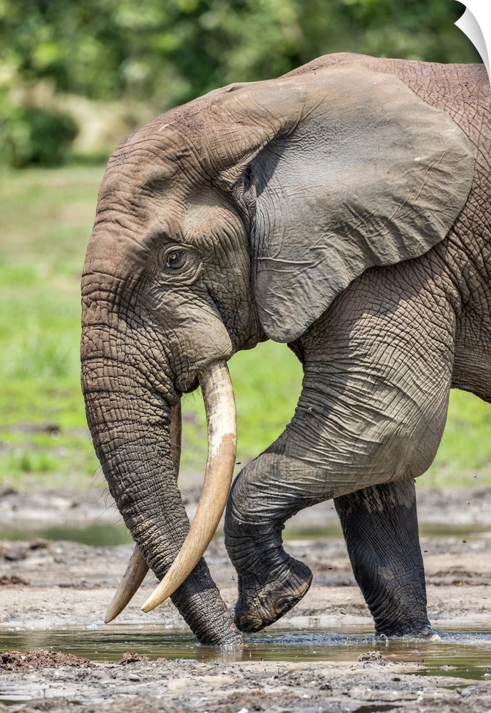 <p>Central African Republic, Dzanga-Ndoki, Dzanga-Bai. A fine bull Forest elephant sucking up minerals at Dzanga-Bai.</p>