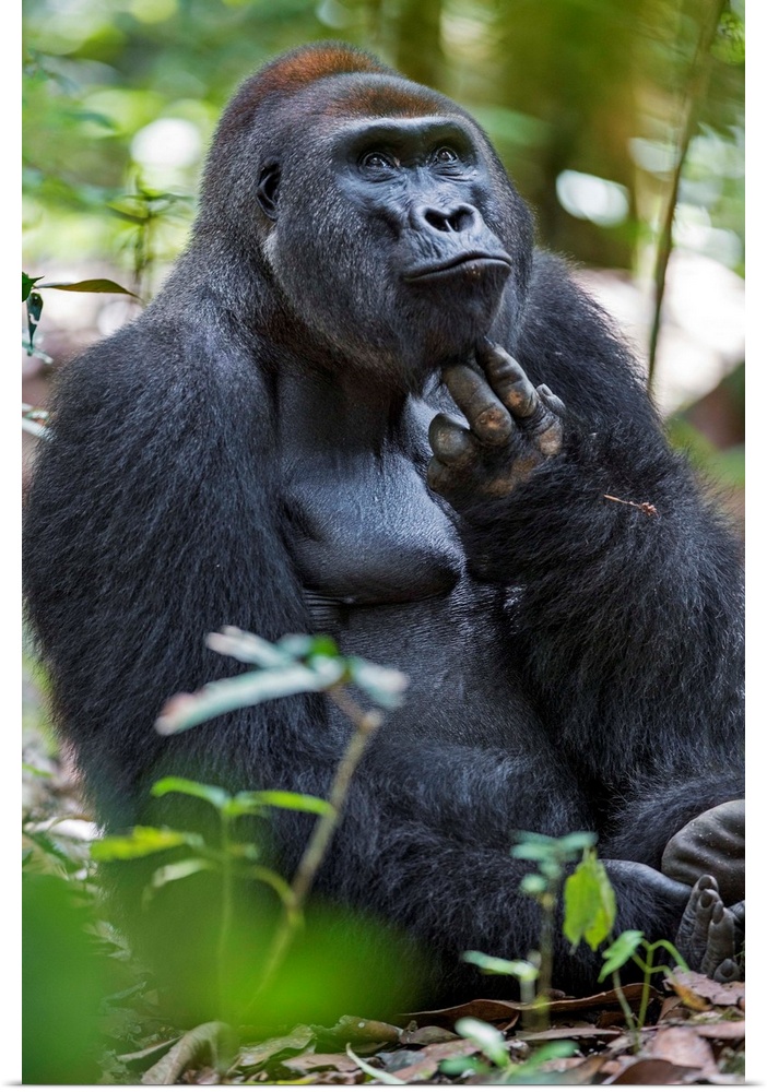 <p>Central African Republic, Bayanga, Dzanga-Sangha, Bai-Hokou. An adult male (silverback) Western lowland gorilla scratches his chin.</p>