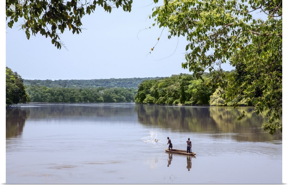 <p>Central African Republic, Bayanga, Sangha River. Sangha-Sangha fishermen cast a large net to catch fish in the Sangha River.</p>
