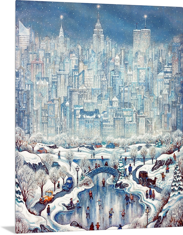 <p>Central Park in the snow, people ice skating, city scape.</p>