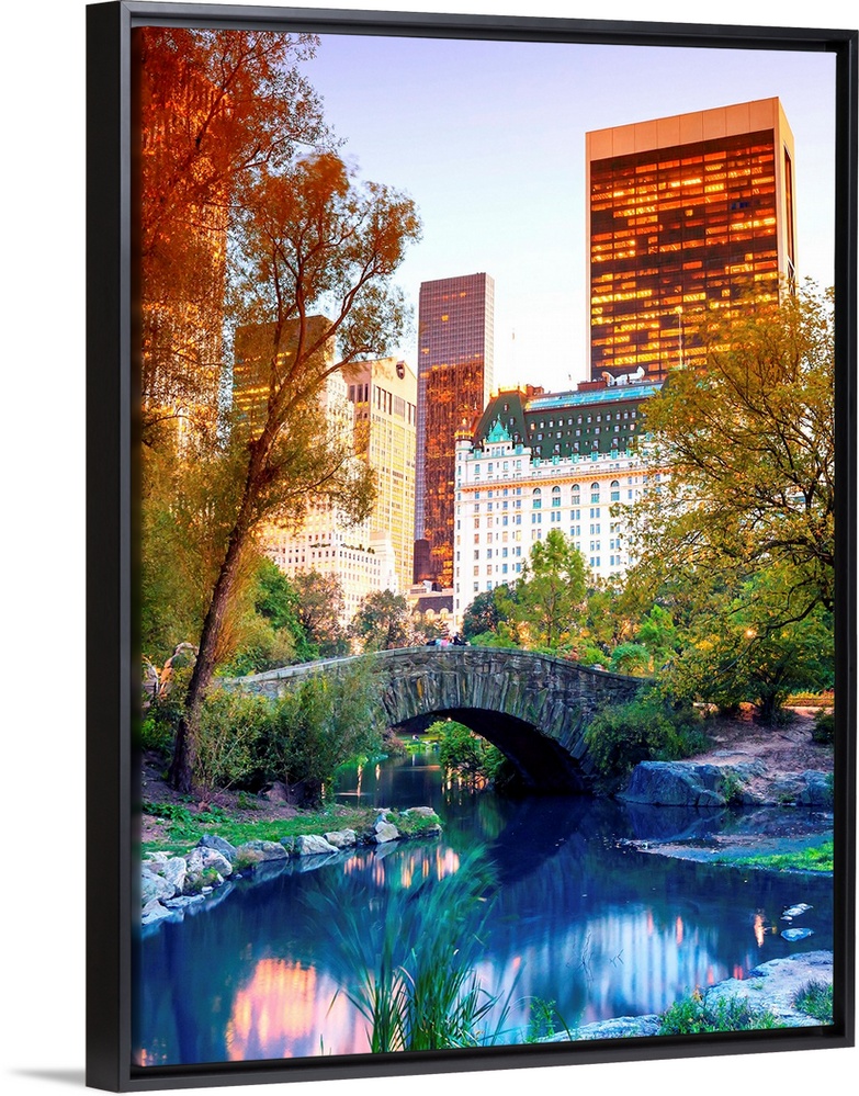 <p>Vividly colored photograph of a bridge over a stream in Central Park, with skyscrapers in the distance.</p>