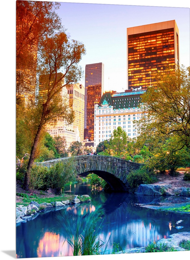 <p>Vividly colored photograph of a bridge over a stream in Central Park, with skyscrapers in the distance.</p>