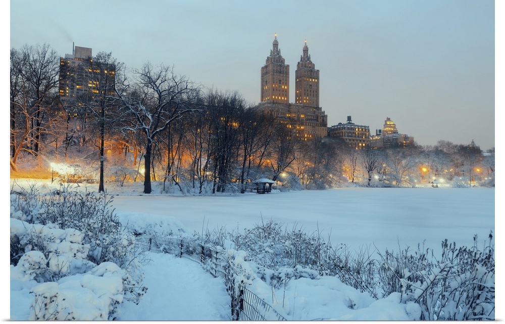 <p>Central Park in winter at night with skyscrapers in midtown Manhattan, New York City.</p>