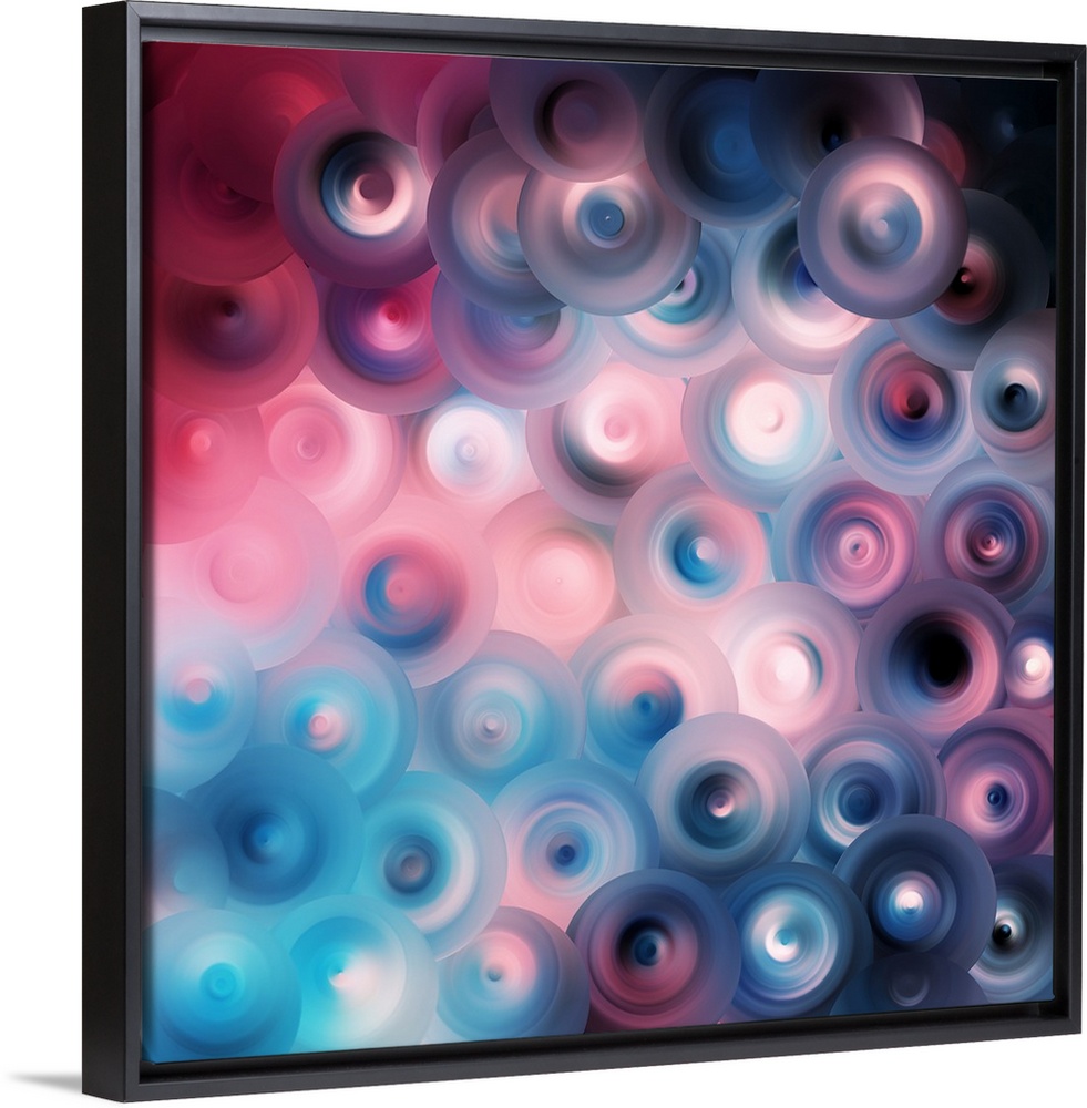 <p>Abstract artwork of overlapping swirling circles in bright shades of blue and pink mixed with dark purple.</p>