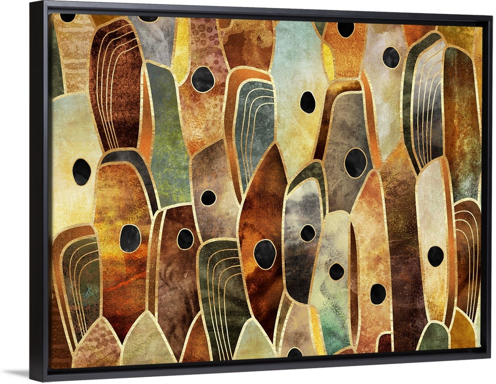 <p>Vertical, organic shapes in shades of brown, grey, cream and slate outlined in gold.</p>