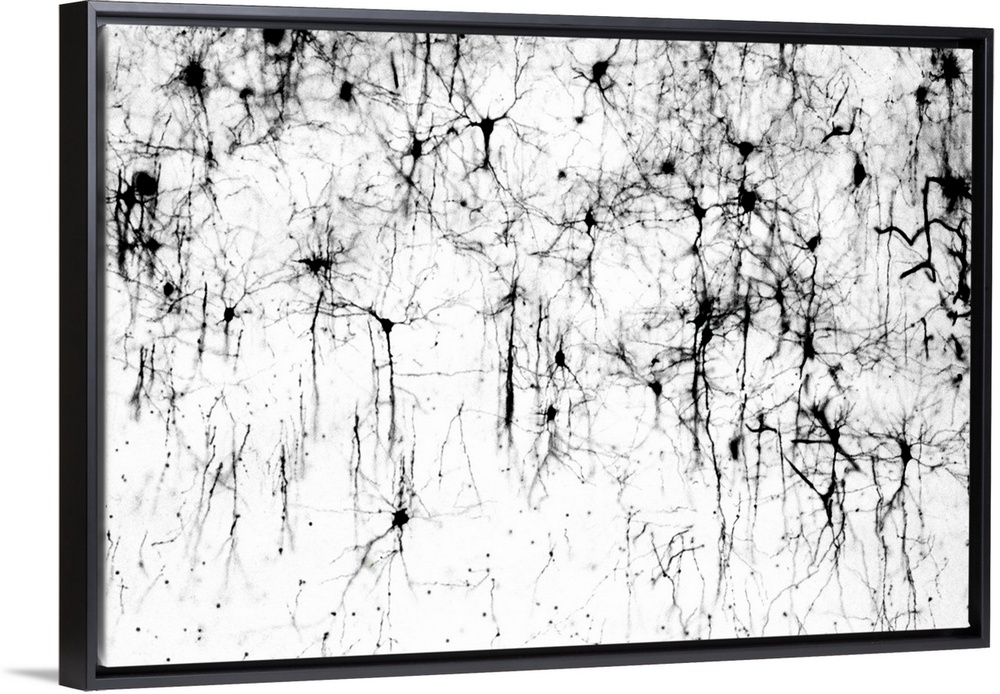 <p>Cerebral cortex nerve cells. Light micrograph of a section through neurones (nerve cells, black) in the cerebral cortex of a human brain. Branching processes (dendrites) receive impulses from other nerve cells and pass them to the cell body. Each cell body also has an axon through which it relays nerve impulses to the dendrites of other neurones. Neurones allow information to be received, interpreted and relayed around the body. The grey matter of the cerebral cortex forms the outer layer of the brain that is responsible for conscious thought, memory and language.</p>