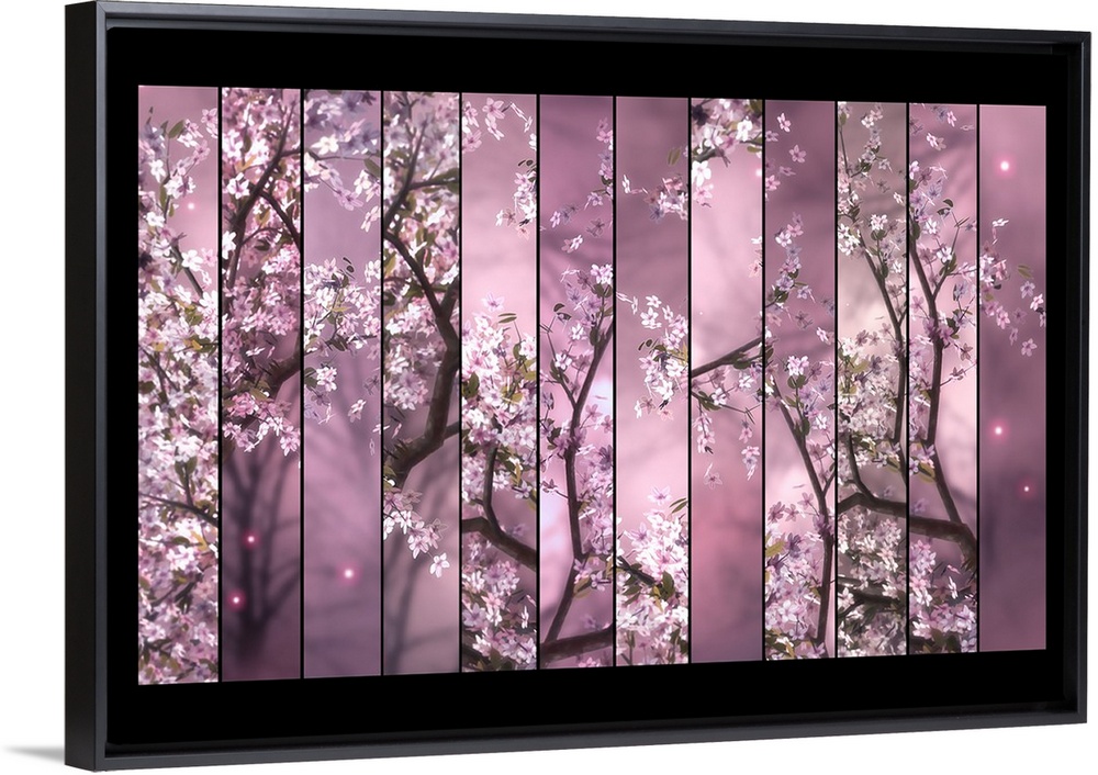 <p>Vertical panels of cherry tree branches full of pink blossoms.</p>