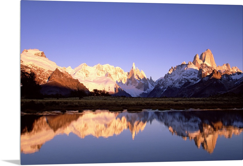 <p>Cerro Torre, centre, and Mount FitzRoy, right, Cerro Solo, left, at dawn famous peaks on edge of Patagonian icecap, Los Glaciares National Park, Patagonia, Argentina</p>