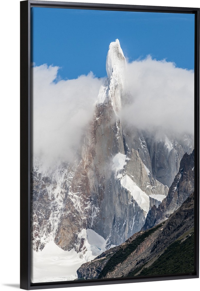 <p>Photograph of snow-covered mountain spires in South America surrounded thick fluffy clouds.</p>