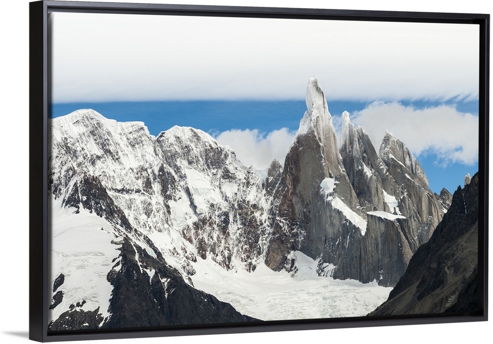 <p>Photograph of snow-covered mountain spires in South America surrounded thick fluffy clouds.</p>