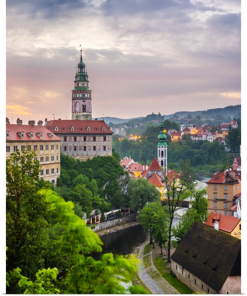 <p>Czech Republic, South Bohemian Region, Cesky Krumlov. Cesky Krumlov Castle and buildings in old town at dawn.</p>