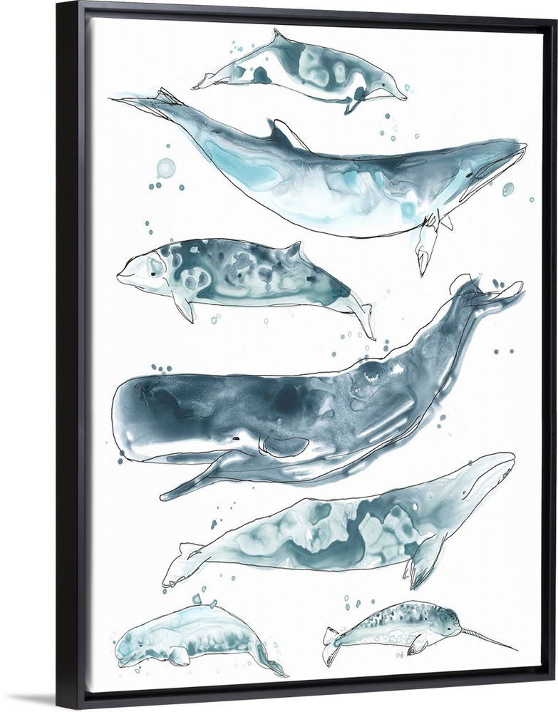 <p>Fun contemporary watercolor drawing of whales in various shades of blue.</p>