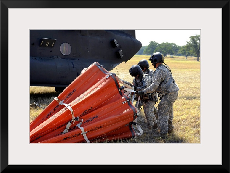 <p>September 6, 2011 - CH-47 Chinook helicopter crew prepare to install the Bambi Bucket on the aircraft. Texas National Guard crews launched out of the Austin Army Aviation Facility to fight wild fires threatening homes and property near Bastrop, Texas.</p>
