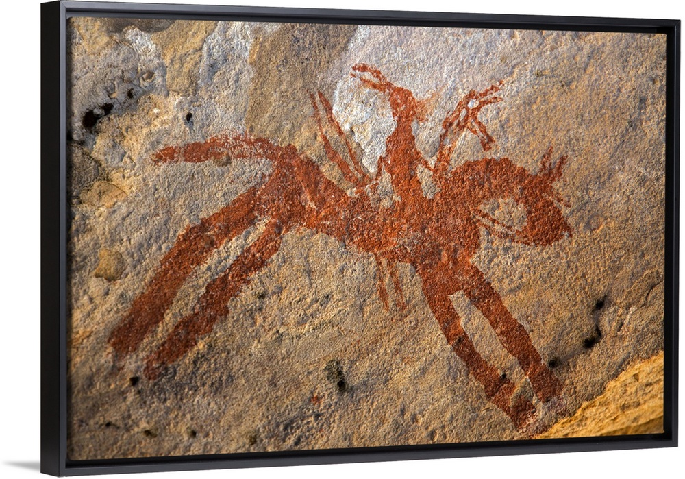 <p>Chad, Guili Dweli, Ennedi, Sahara. A painting of a horse and rider possibly carrying a bow and lance decorates the sandstone wall of a cave.</p>