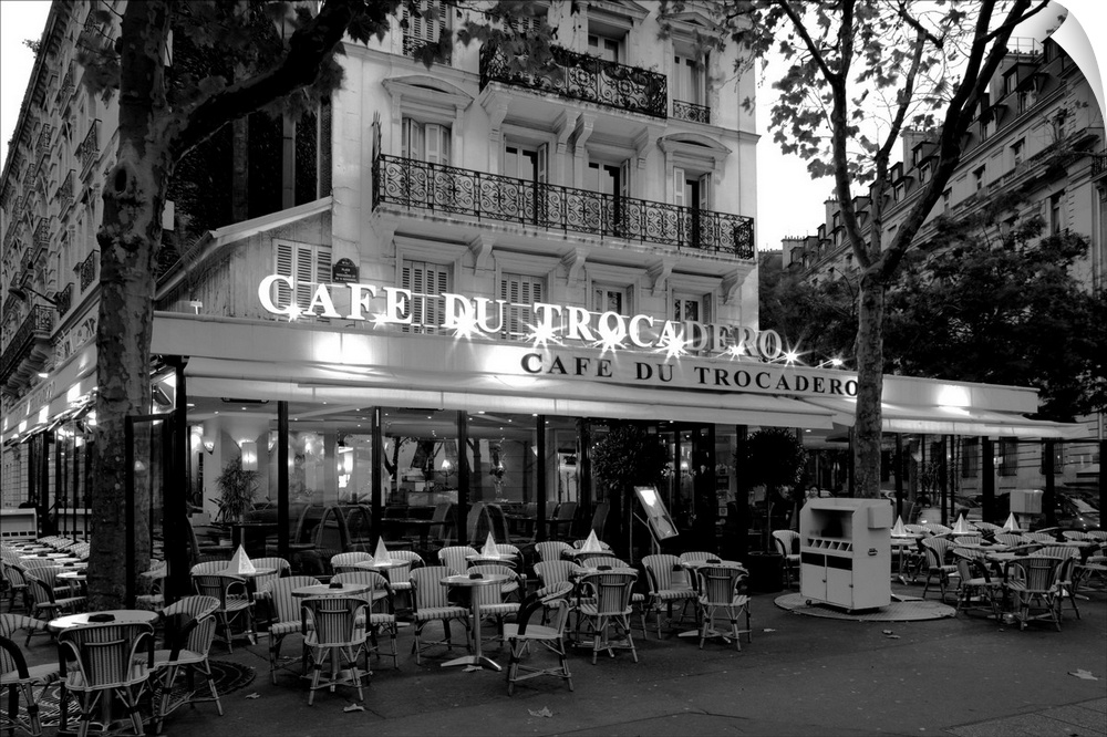 <p>Chairs and tables in a restaurant at dawn, Cafe Du Trocadero, Paris, Ile-de-France, France</p>