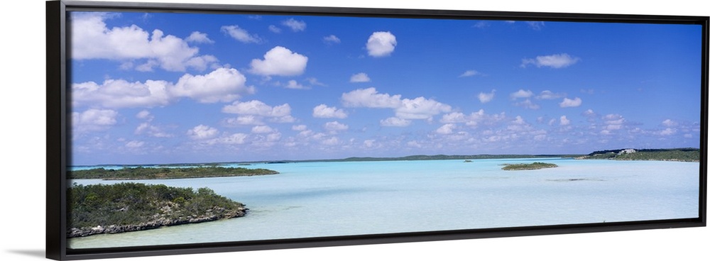 <p>Panoramic photograph of inlet with grass covered sand bars under cloudy skies.</p>