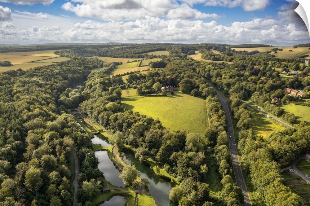 <p>Aerial drone view of Chalk Springs. Nestled in the heart of the South Downs National Park near the market town of Arundel, West Sussex. Chalk Springs Fishery was originally established in 1984 on the site of the old watercress beds, which were extended in 1986 with two further lakes.</p>