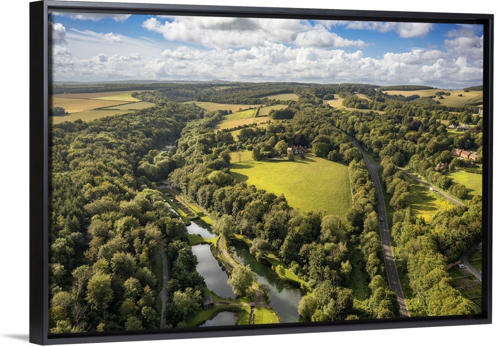 <p>Aerial drone view of Chalk Springs. Nestled in the heart of the South Downs National Park near the market town of Arundel, West Sussex. Chalk Springs Fishery was originally established in 1984 on the site of the old watercress beds, which were extended in 1986 with two further lakes.</p>