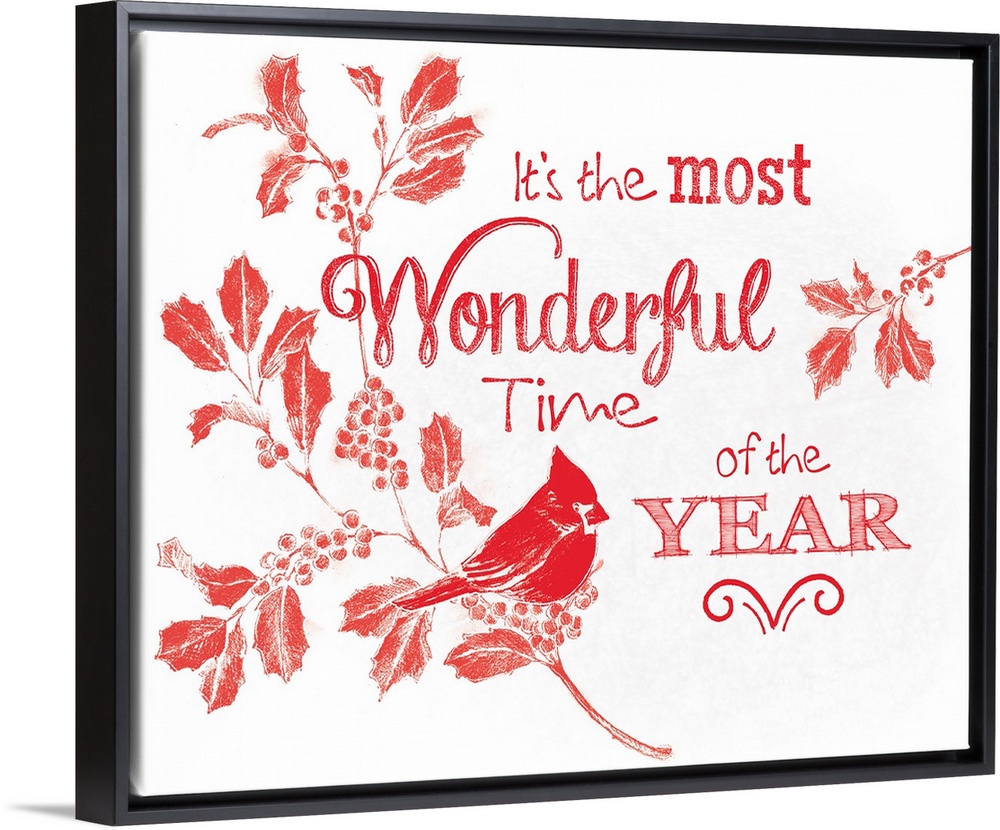 <p>"It's The Most Wonderful Time Of The Year" in red with a bird and seasonal flowers on a white background.</p>