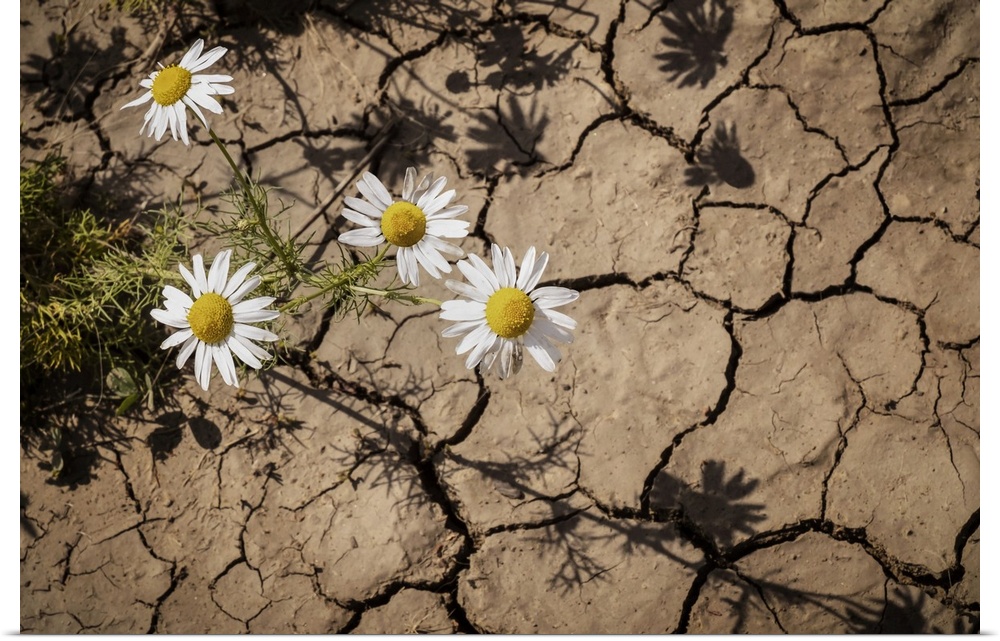 <p>Scentless Chamomile (Anthemis arvensis) growing through cracks in the dry earth; Stony Plain, Alberta, Canada</p>