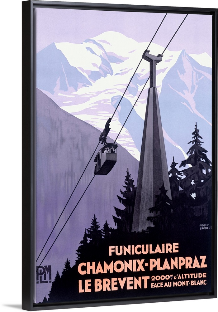 <p>This vertical wall art an Art Deco travel poster of a cable car passing through the Alps with French text on it.</p>