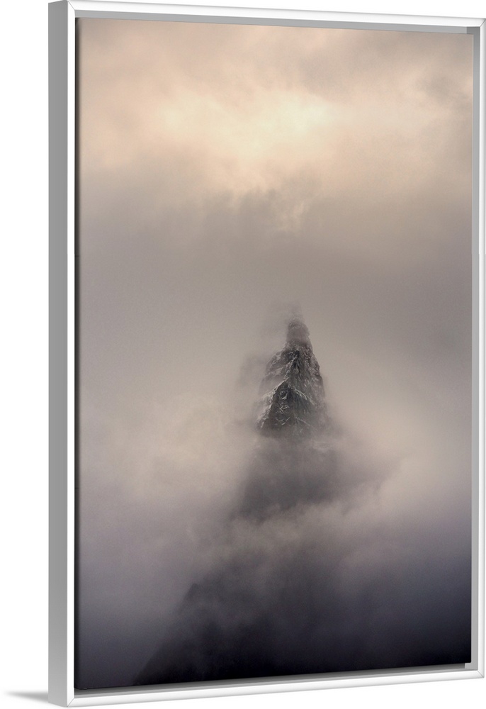 <p>Mountain top, Aiguille des Dru, in the fog in the valley of Chamonix in French Alpes.</p>