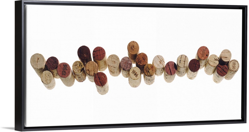 <p>Corks from various wine bottles stand straight up and are lined next to each other on a white surface.</p>