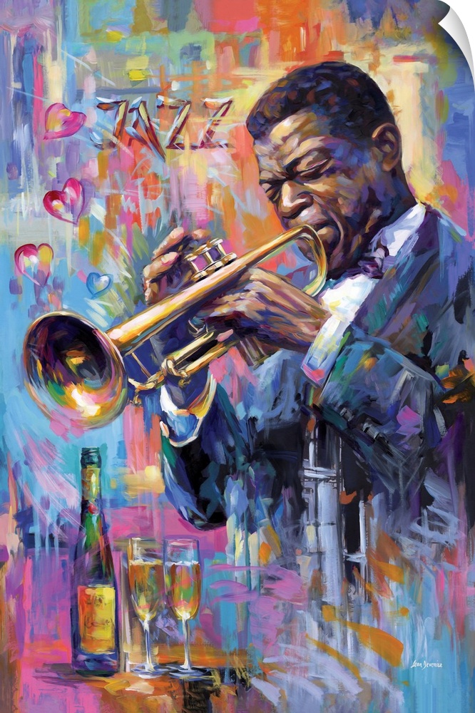 <p>A soulful musician immersed in the rhythm of jazz, passionately playing the trumpet against a backdrop of bold colors and lively energy. Floating hearts and the word "Jazz" add a playful, romantic touch, while a bottle of champagne and two glasses below set the mood for celebration. This vibrant piece captures the spirit of music, love, and joy, making it a striking addition to any space.</p>