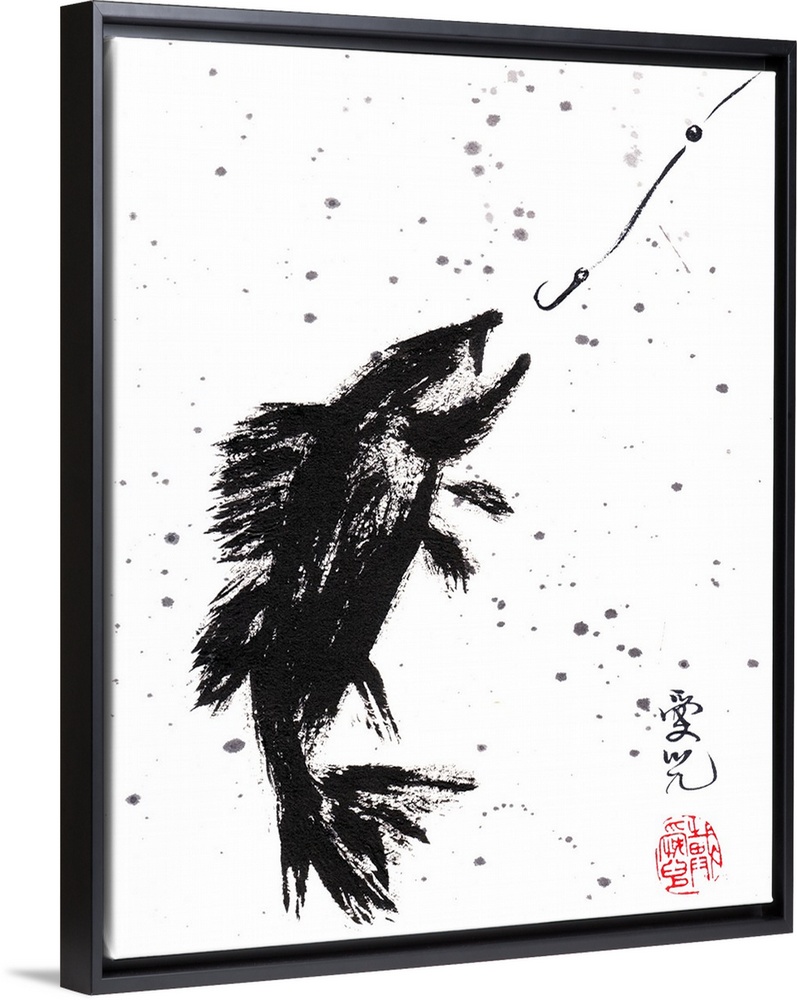 <p>Chinese ink and splatter painting of a fish about to bite a hook.</p>