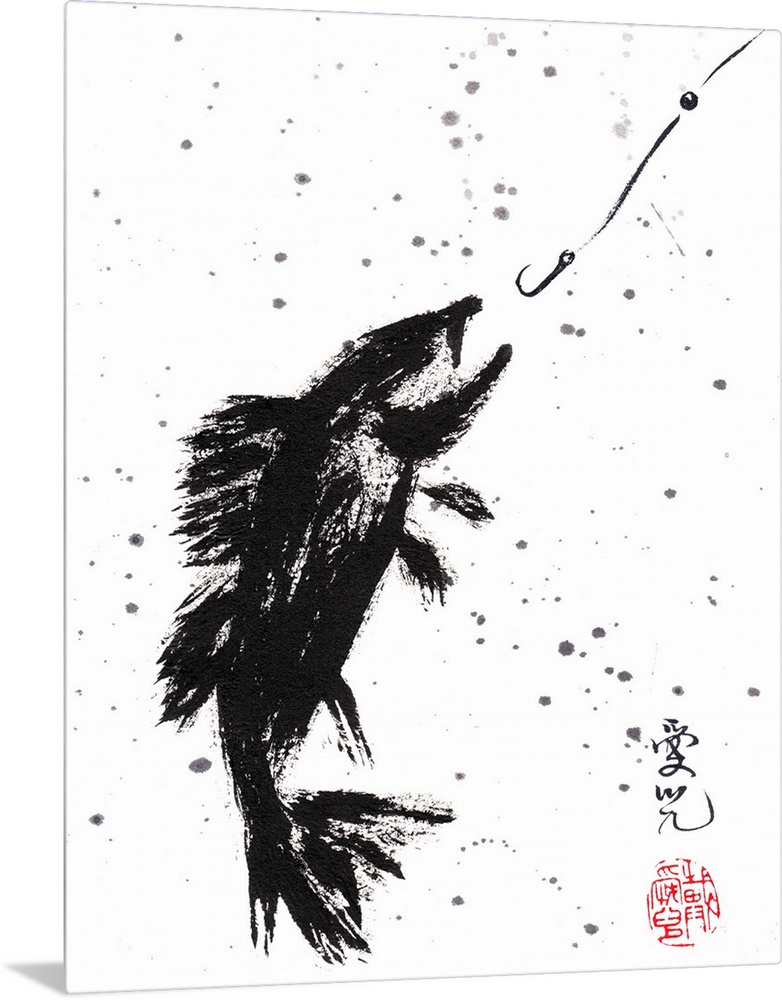 <p>Chinese ink and splatter painting of a fish about to bite a hook.</p>